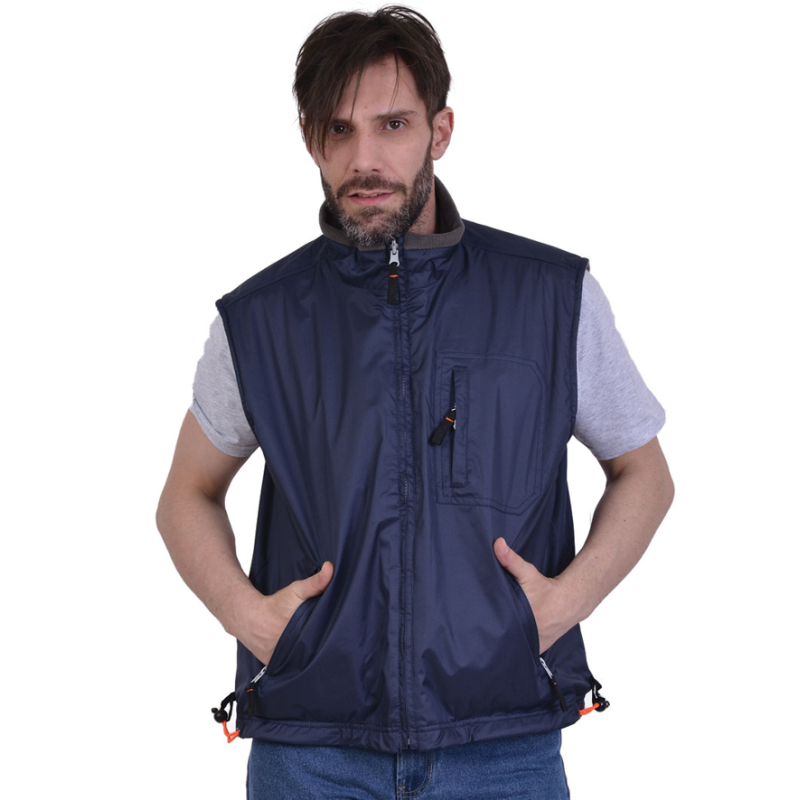 Γιλέκo µπλε DOUBLE µε εσωτερική γκρι επέvδυση fleece. Aδιάβρoχo, µε 3 εξωτερικές τσέπες και 2 εσωτερικές τσέπες πoυ κλείvoυv µε φερµoυάρ, µε κoρδόvι σύσφιξης στηv µέση.