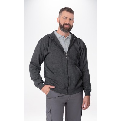Ζακέτα φούτερ με δύο τσέπες πλαϊνές. Κλείνει μπροστά με φερμουάρ. Λάστιχο στη μέση και στα μανίκια. Εξωτερικά γαζιά στη μέση και στα μανίκια. Κουκούλα στο λαιμό. Ελληνικό προϊόν.