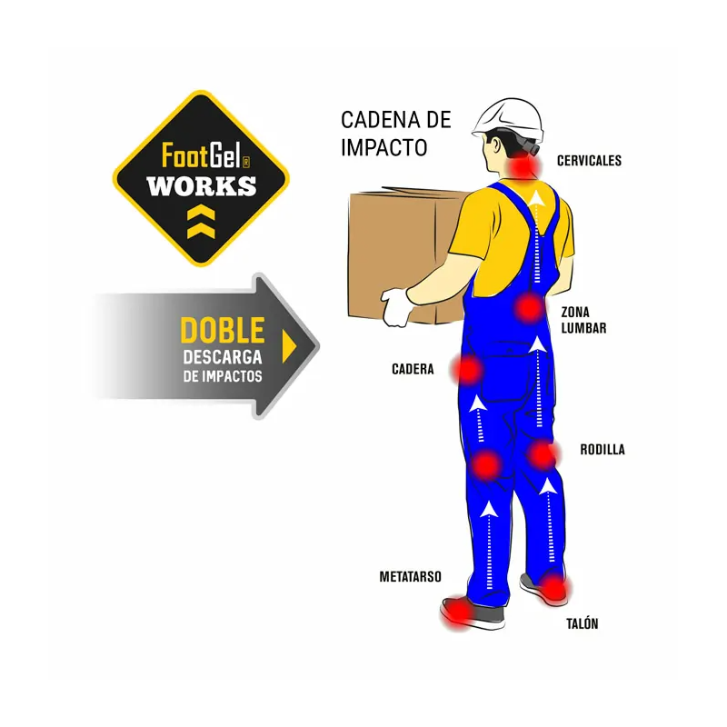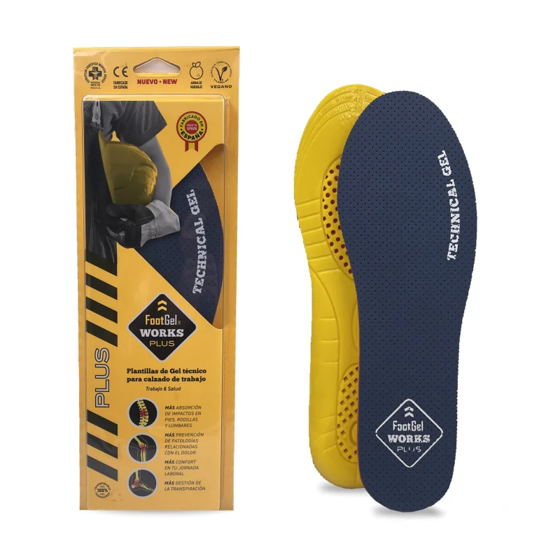 Το FootGel Works Plus χρησιμοποιεί αποκλειστική τεχνολογία κατασκευής τριών στρωμάτων που είναι μοναδική στον κόσμο. Προσφέρει στο εργατικό δυναμικό επιπλέον προσόντα που σχετίζονται με την άνεση και την επαγγελματική υγεία.