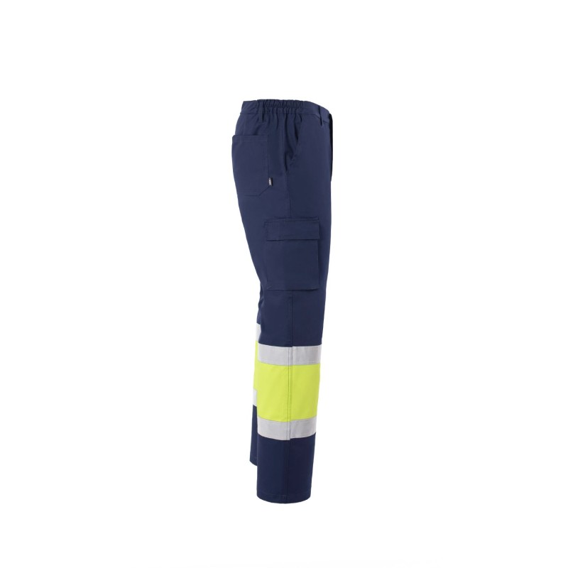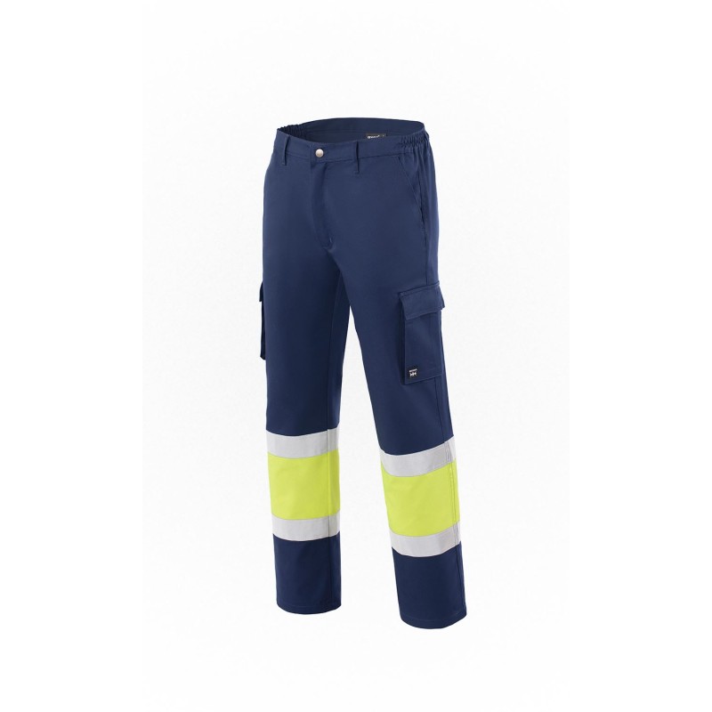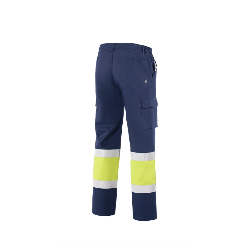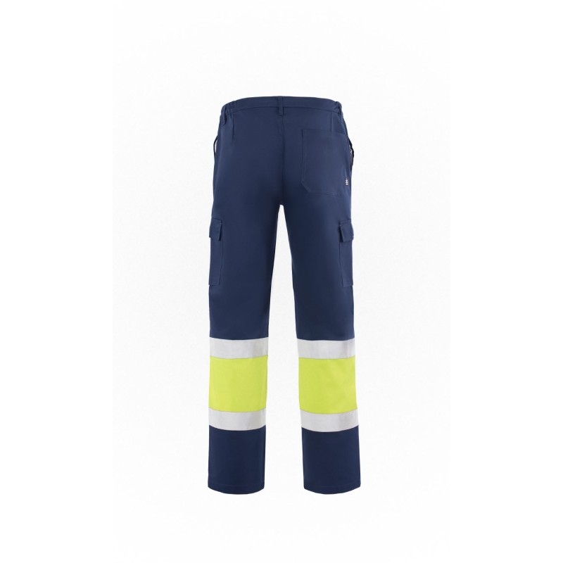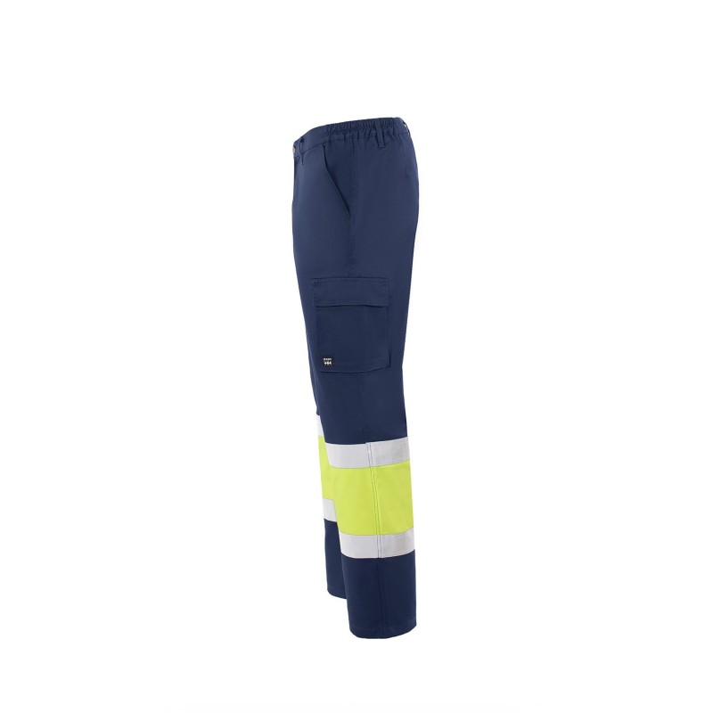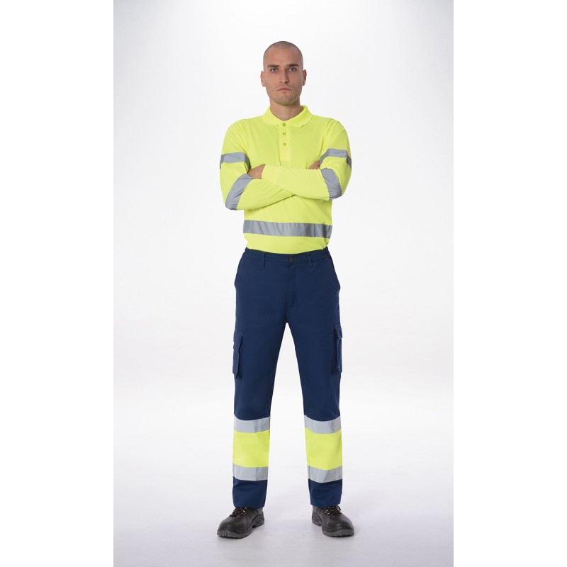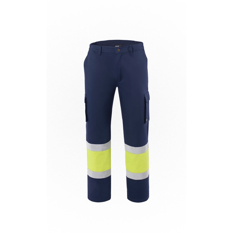 Κλείνει μπροστά με κουμπί και φερμουάρ που καλύπτεται με πατιλέτα. Δύο τσέπες λοξές μπροστά στη μέση. Μια τσέπη. Δύο τσέπες πλαϊνές στουςμηρούς τύπου φυσούνα πίσω που κλείνουν με καπάκι. Πέντε θηλύκια συγκράτησης ζώνης. Δύο ασημί ανακλαστικές ταινίες περιμετρικά στα μπατζάκια. Λάστιχο στα πλαϊνά μέρη της μέσης. Ελληνικό προϊόν.
